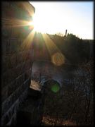 Artėjanti prie horizonto saulė apšviečia dešiniojo kranto tilto atramą žiemos saulėgrįžos dieną. Fotografija dešinėje padaryta likus porai minučių iki to momento, kai saulės diskas pasislėpė už aukštų priešingo kranto miško medžių viršūnių. Šviesos dėmės landos nišoje (tunelis?) kelia asociacijas su senųjų civilizacijų saulės kulto šventyklomis (Oziris, Ra, Amonas...). |