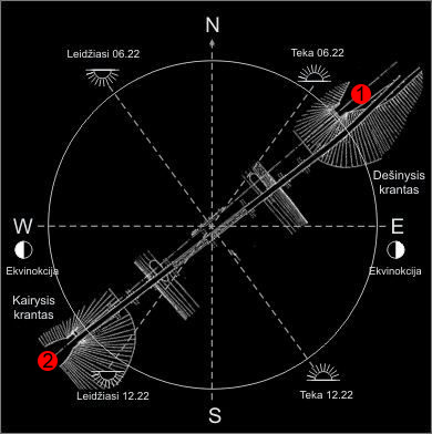 Schema: Alytaus geležinkelio tilto orientavimas pasaulio šalių atžvilgiu ir saulės patekėjimo ir laidos saulėgrįžos dienomis taškų išdėtymas (teorinis). Schemoje panaudotas laikinojo (vokiečių) tilto brėžinys. Originalaus rusiško tilto linija pažymėta punktyrine linija tarp taškų 1 - 2. |